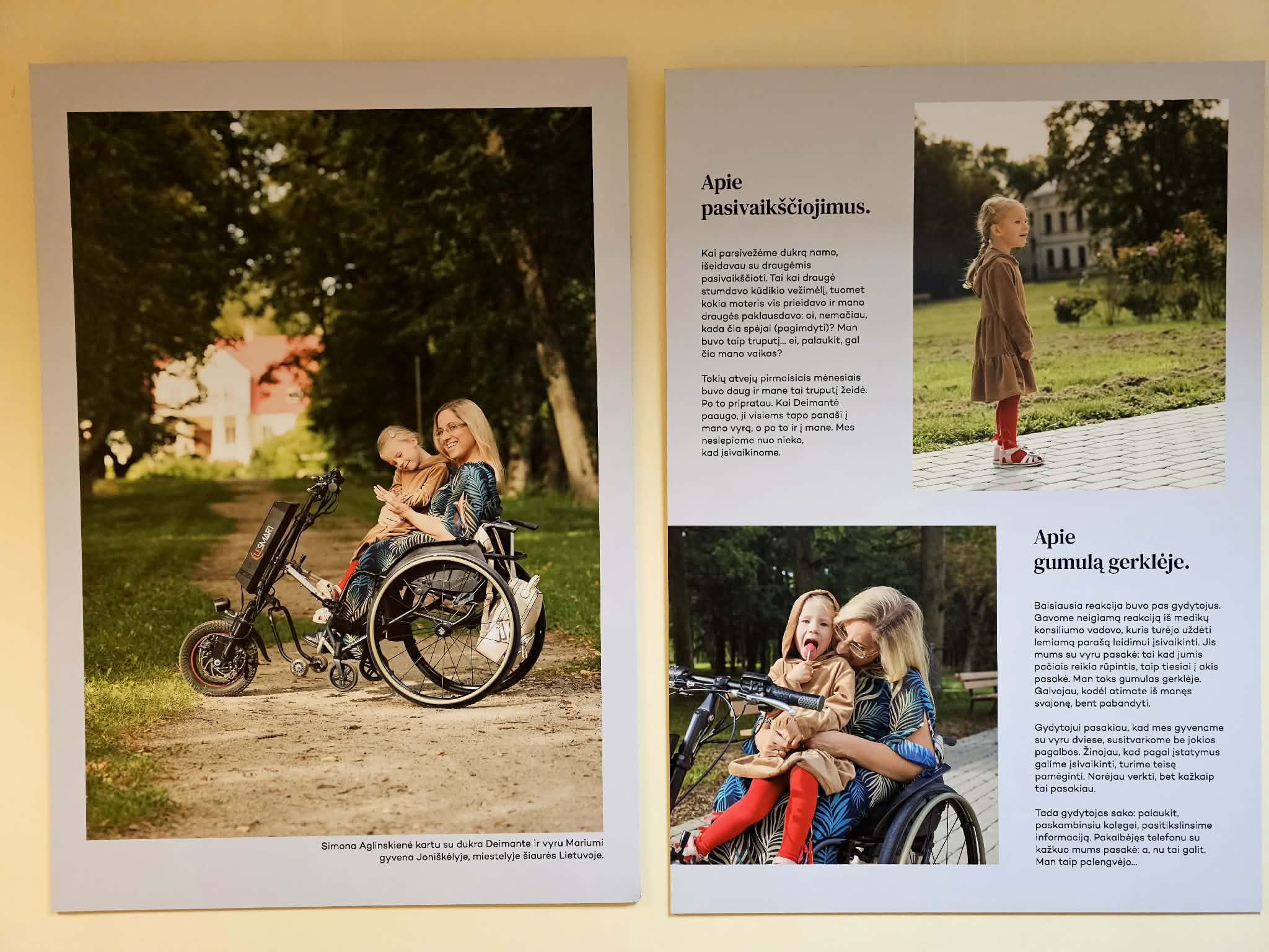 Paroda „Motinystė ir negalia" finansuojama projekto „LNF efektyvi advokacija, atstovaujant žmonių su negalia teisėms ir interesams" lėšomis. Projektui valstybės biudžeto lėšų skyrė konkursą organizavusi įstaiga Asmens su negalia teisių apsaugos agentūra prie LR Socialinės apsaugos ir darbo ministerijos. Paroda apkeliavo ne vieną organizaciją Lietuvoje ir pasiekė užsienio šalis. „Paprastai moterys patiria spaudimą tapti mamomis, tačiau visuomenės lūkesčiai kardinaliai keičiasi, kai kalba pasisuka apie moteris su negalia. Dalis jų vis dar jaučiasi privalančios aplinkai įrodyti, kad geba puikiai rūpintis savo vaikais. Dalindamiesi akimirkomis iš mamų su negalia kasdienybės tikime, kad jos padės kitomis akimis pamatyti motinystės patirčių įvairovę. Taip pat viliamės, jog septynių mamų istorijos leis įsitikinti, kad pagalbos poreikis, beje, būdingas bet kuriai mamai, nėra kliūtis mylėti ir rūpintis. Motinystė niekam nėra lengvas kelias, tačiau kai jame susiduriame ir su negalia, reikia pasiruošti didesniems sunkumams. Vieni iššūkiai gali atsirasti dėl pačios negalios – sunku suvystyti, negali matyti, kur vaikas eina, girdėti, ar neverkia, užkelti ant čiuožyklos ir palaikyti ranką, kol jam ar jai dar baugu čiuožti savarankiškai. Kitos kliūtys, keliančios ypač daug skausmo, susijusios su griežtai vertinančiu aplinkinių žvilgsniu – ar gali auginti vaiką mama, kuriai pačiai reikia pagalbos? O jeigu jau augina, ar yra pakankamai gera mama?", – apie fotopasakojimo ciklą „Motinystė ir negalia" pasakoja jį inicijavusio Lietuvos negalios organizacijų forumo Advokacijos vadovė Simona Aginskaitė.