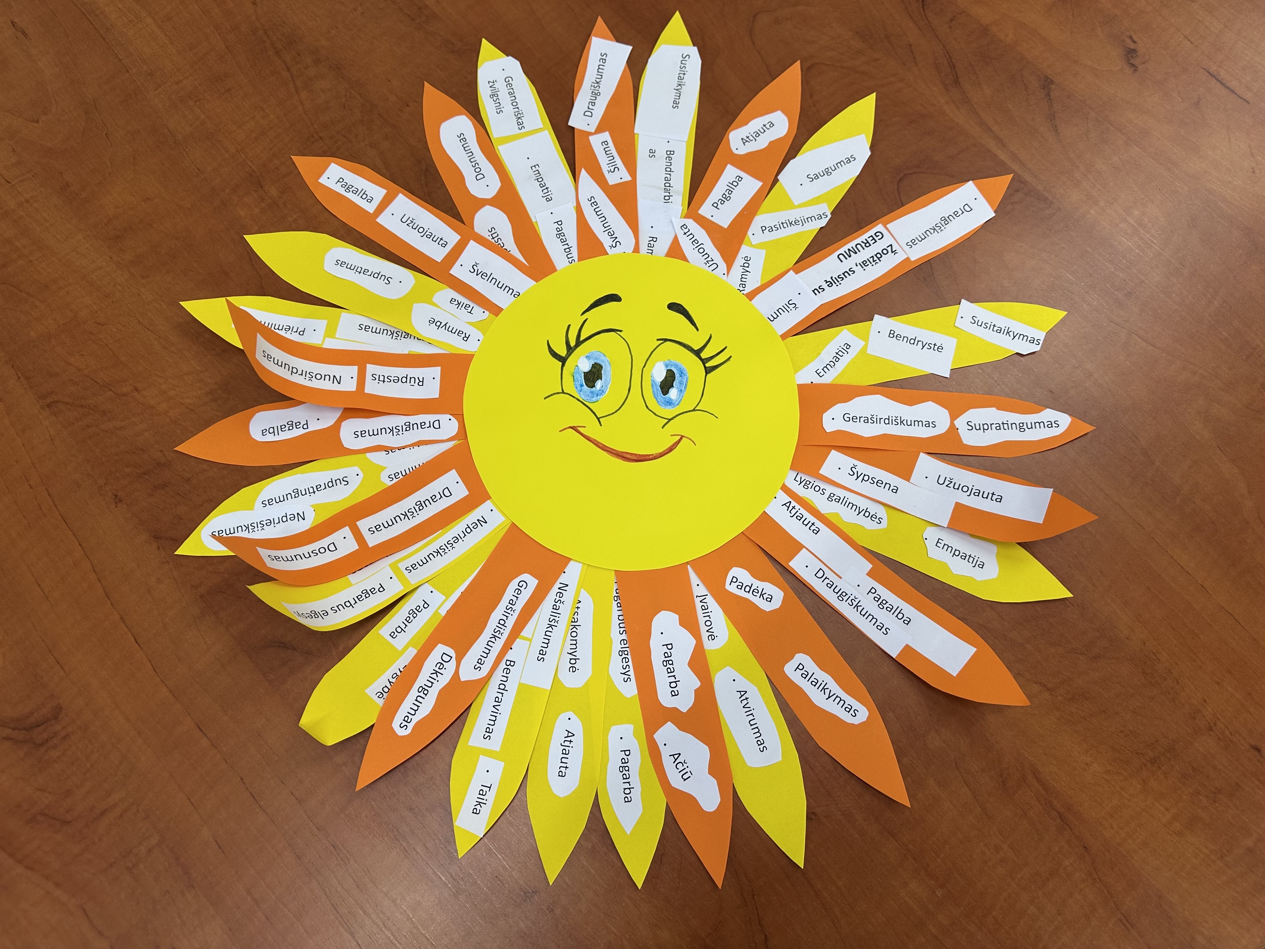 Renginį užbaigėme kūrybine veikla. Kūrėme „Gerumo saulę“. Jos spinduliuose sudėjome žodžius ir mintis, kurios iškilo diskusijų metu: kas mums yra gerumas, kokia tolerancijos reikšmė, kokius gražius veiksmus galime atlikti kasdien. „Gerumo saulė“ tapo bendru mūsų kūrybiniu simboliu, primenančiu, kad kiekvienas gerumo spindulys prasideda nuo manęs paties ir sklinda tolyn, šildydamas kitus.