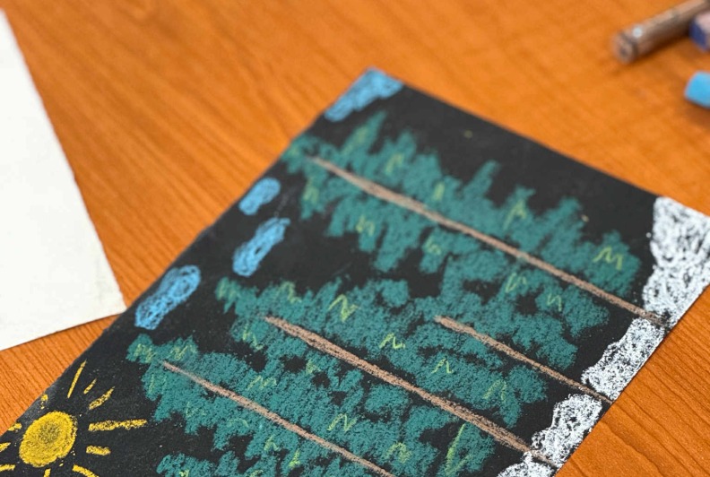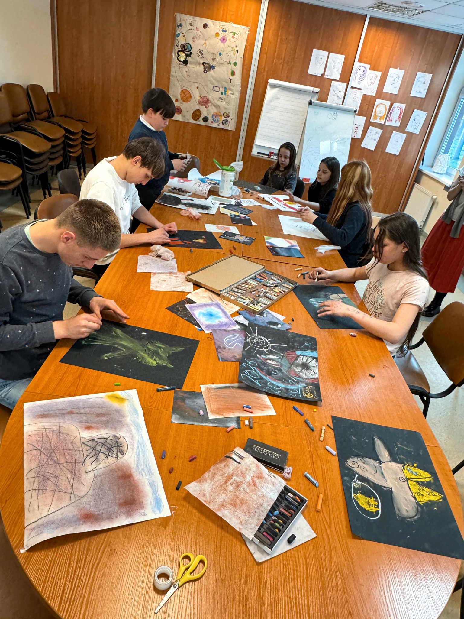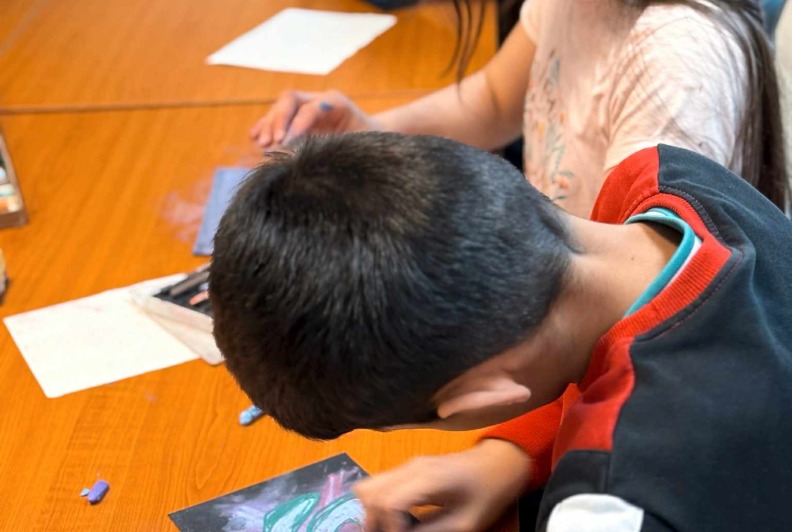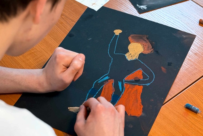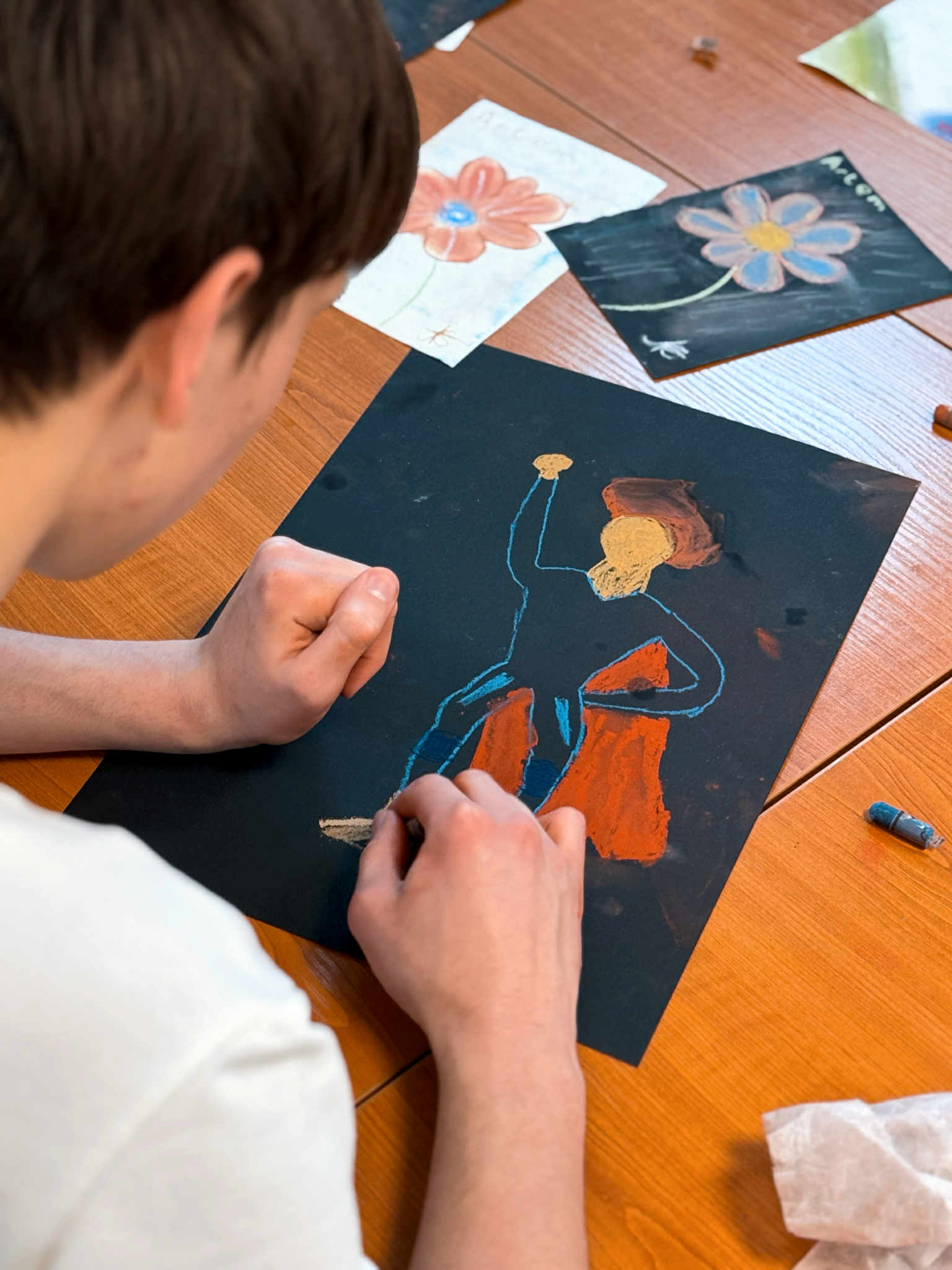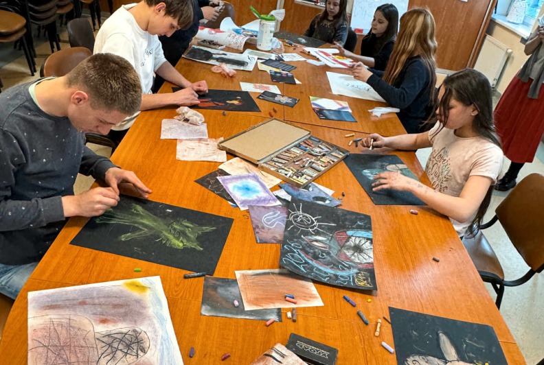 Įgyvendinant projektą „Vaikų gerovės stiprinimas per sociokultūrines veiklas Varėnos mieste“, ketvirtasis dailės terapijos susitikimas tapo spalvinga kelione į vaikų vidinį pasaulį. Šį kartą dalyviai išbandė piešimo kreidelėmis techniką, kuri dėl savo tekstūros ir ryškumo leido vaikams drąsiai, be baimės suklysti, lieti emocijas popieriuje.