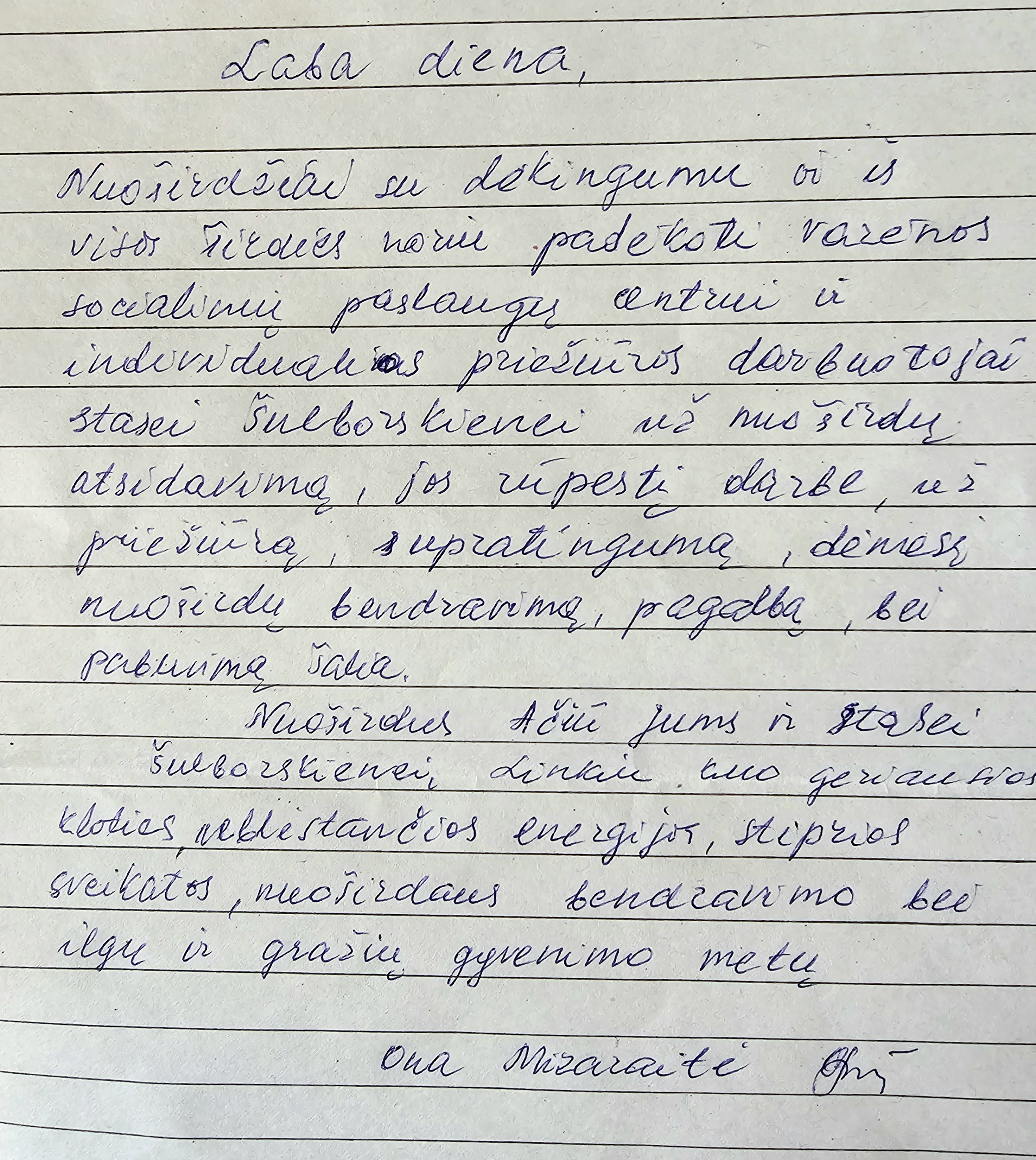 Savo laiške pagalbos į namus paslaugų gavėja Ona Mizaraitė, kreipiasi į Varėnos socialinių paslaugų centro bendruomenę, norėdama viešai padėkoti individualios priežiūros darbuotojai Stasei Šulborskienei.