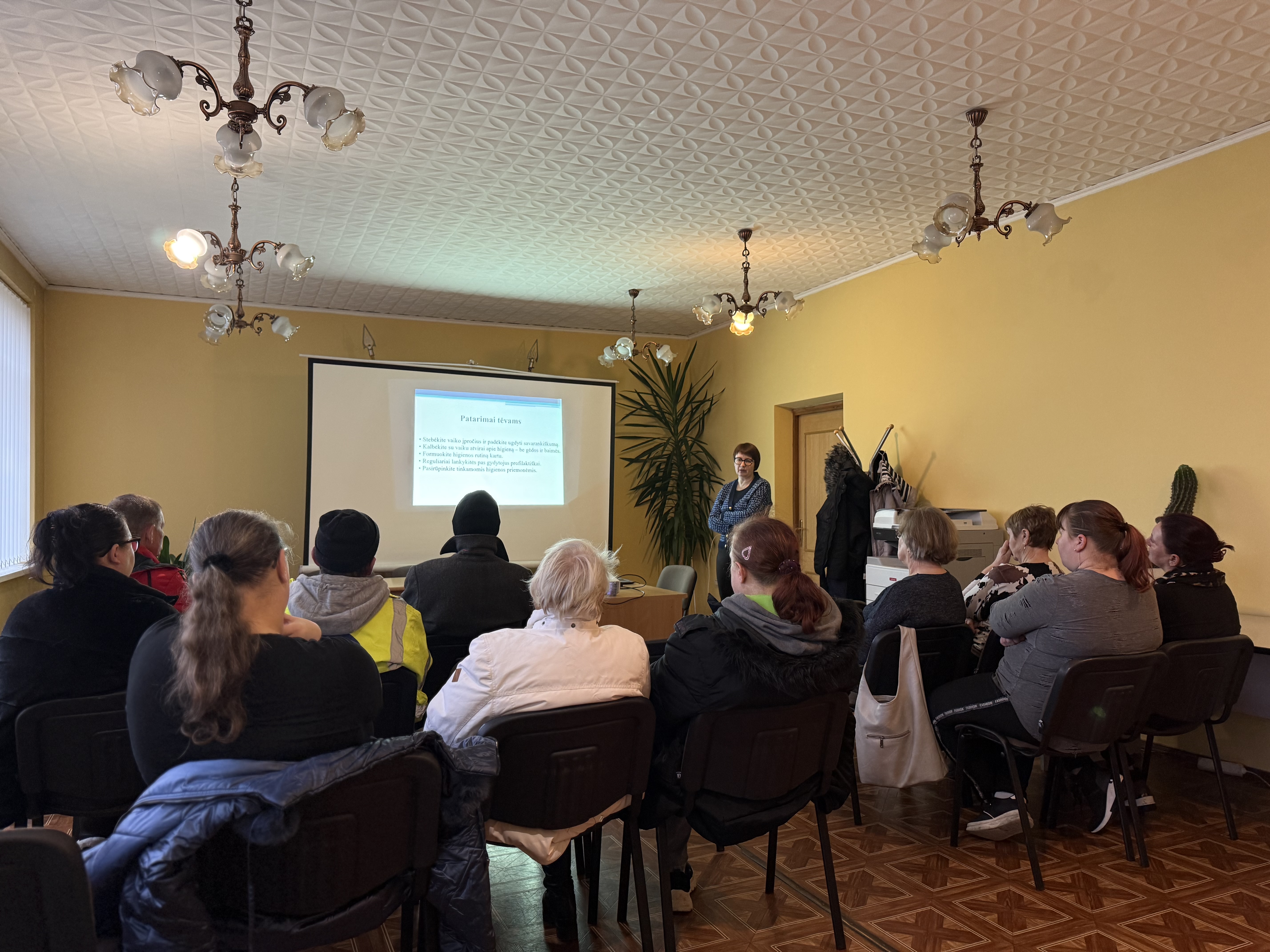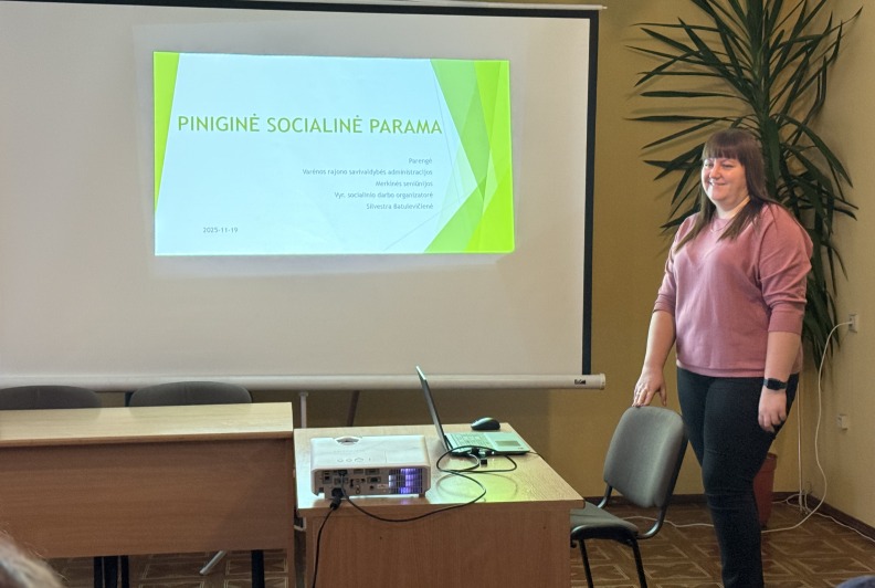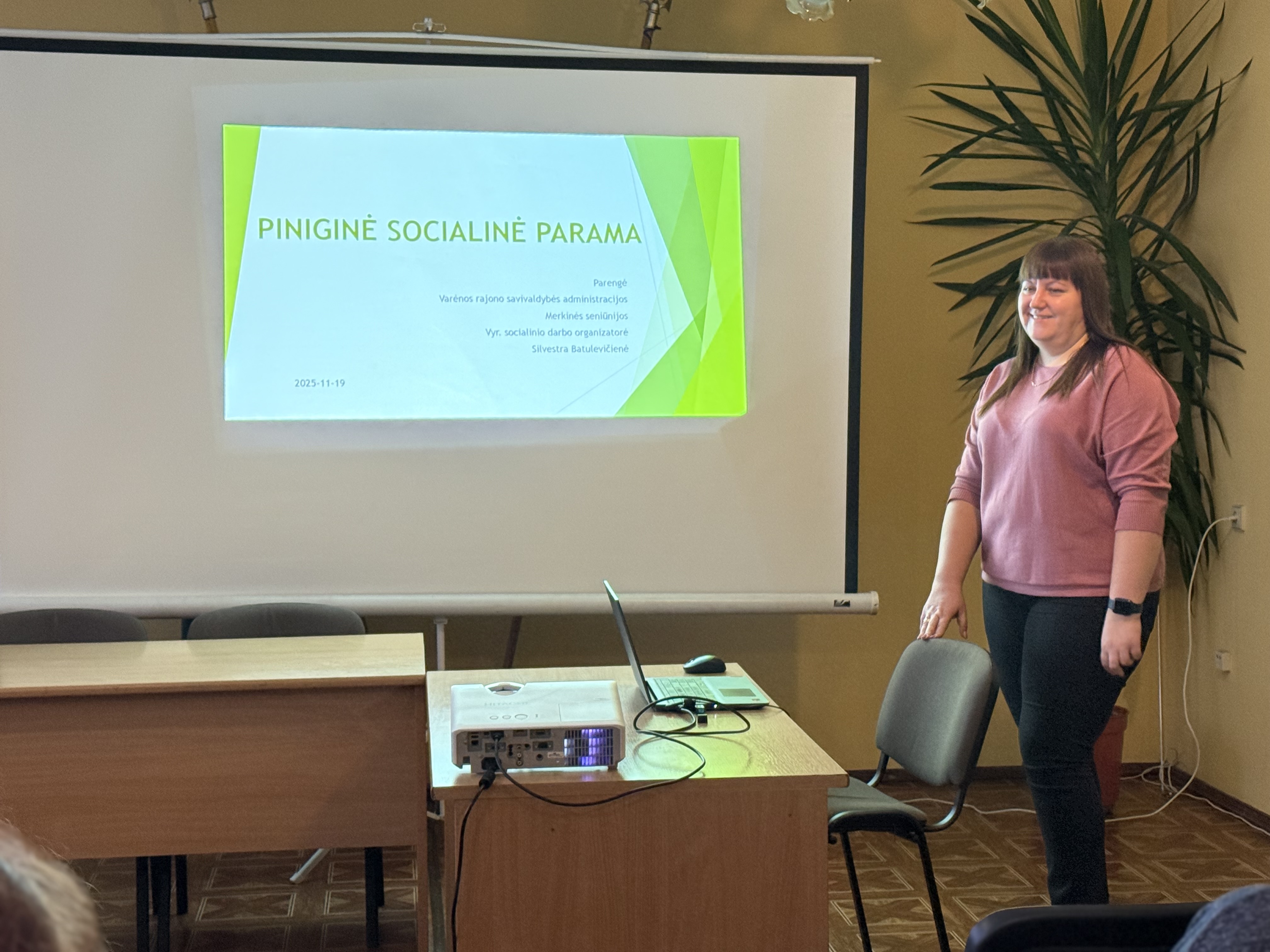 Varėnos rajono savivaldybės administracijos Merkinės seniūnijos socialinio darbo organizatorė Silvestra Batulevičienė išsamiai pristatė piniginės socialinės paramos teikimo principus, ją gaunančių asmenų teises ir pareigas, taip pat piniginės socialinės paramos rūšis, jų dydžius ir teikimo sąlygas.