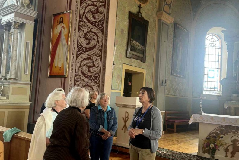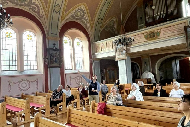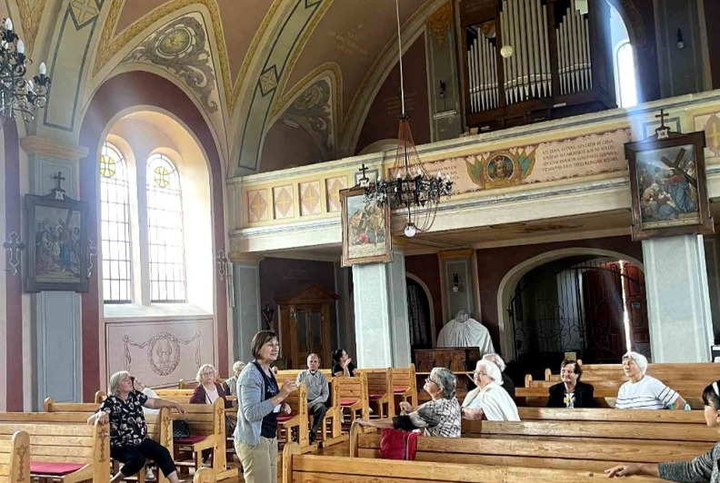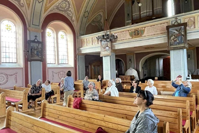 Po muziejaus lankymo, senjorų grupė kartu su gide Marija, pasuko link Perlojos Švč. Mergelės Marijos ir šv. Pranciškaus Asyžiečio bažnyčios. Ekskursijos dalyviai susipažino su Perlojos bažnyčios istorija. Pirmąją Perlojos bažnyčią apie 1428 metus pastatė Vytautas Didysis. 1930 m. pašventinama nauja Švč. Mergelės Marijos ir šv. Pranciškaus Asyžiečio bažnyčia, kuri II pasaulinio karo metais buvo išdekoruota. Dvasinės šventovės vidų puošia 1943 metais iš natūralių dažų sukurtas itin aukšto meninio lygio dekoras, valstybiniai bei patriotiniai akcentai, ji yra pati lietuviškiausia visoje Lietuvoje. Bažnyčios skliautuose nutapyti svarbiausi lietuvybės simboliai – Vytis, Gedimino stulpai, Jogailaičių kryžius, trispalvė, Vytauto Didžiojo portretas, išrašyti Lietuvos ir ateitininkų himnai ir, žinoma, legendinis kunigaikštis Perlius su šūkiu: „Už Perloją ir visą Lietuvą!“. Bažnyčioje galima pamatyti iš senosios maumedžio bažnyčios, pastatytos 1777 metais, išlikusias kryžiaus kelio stotis.