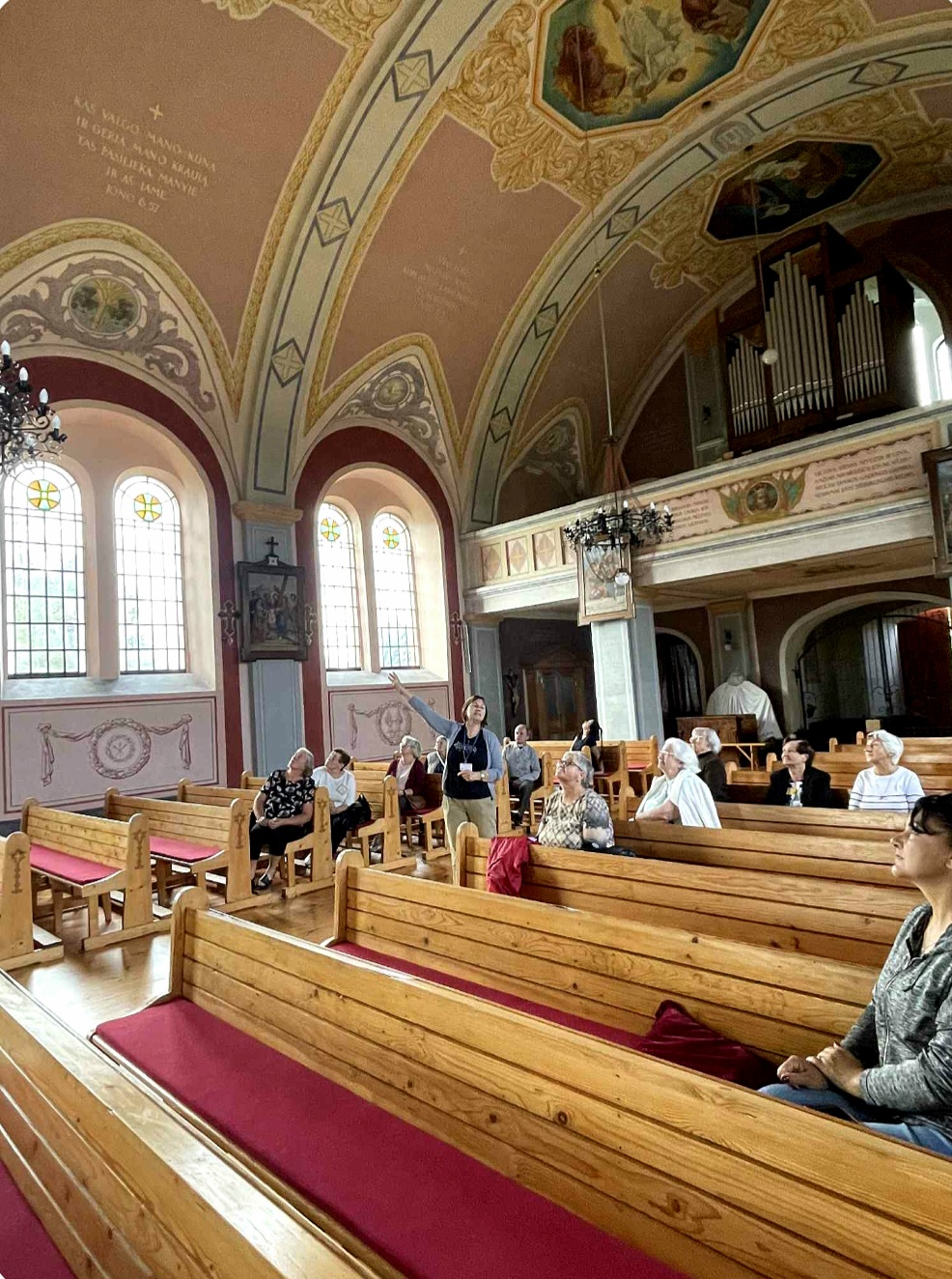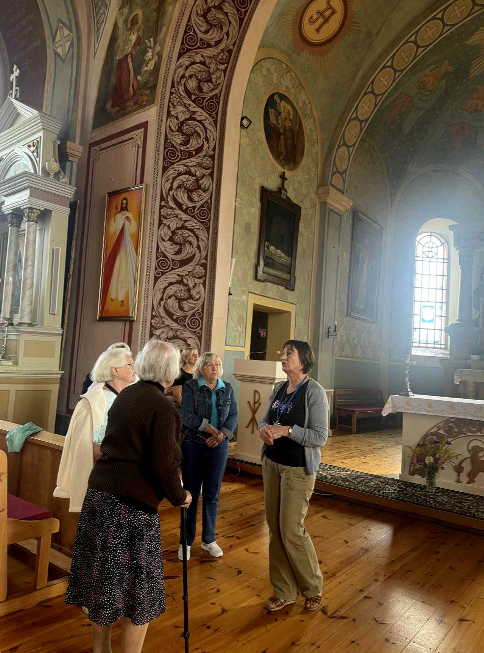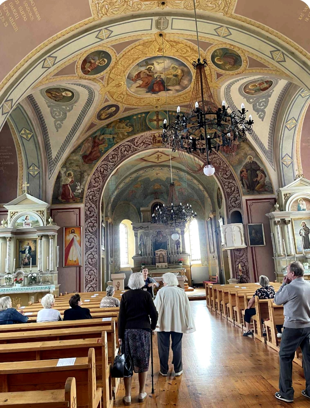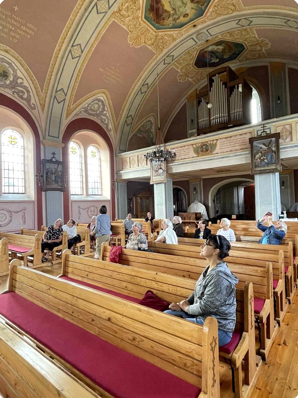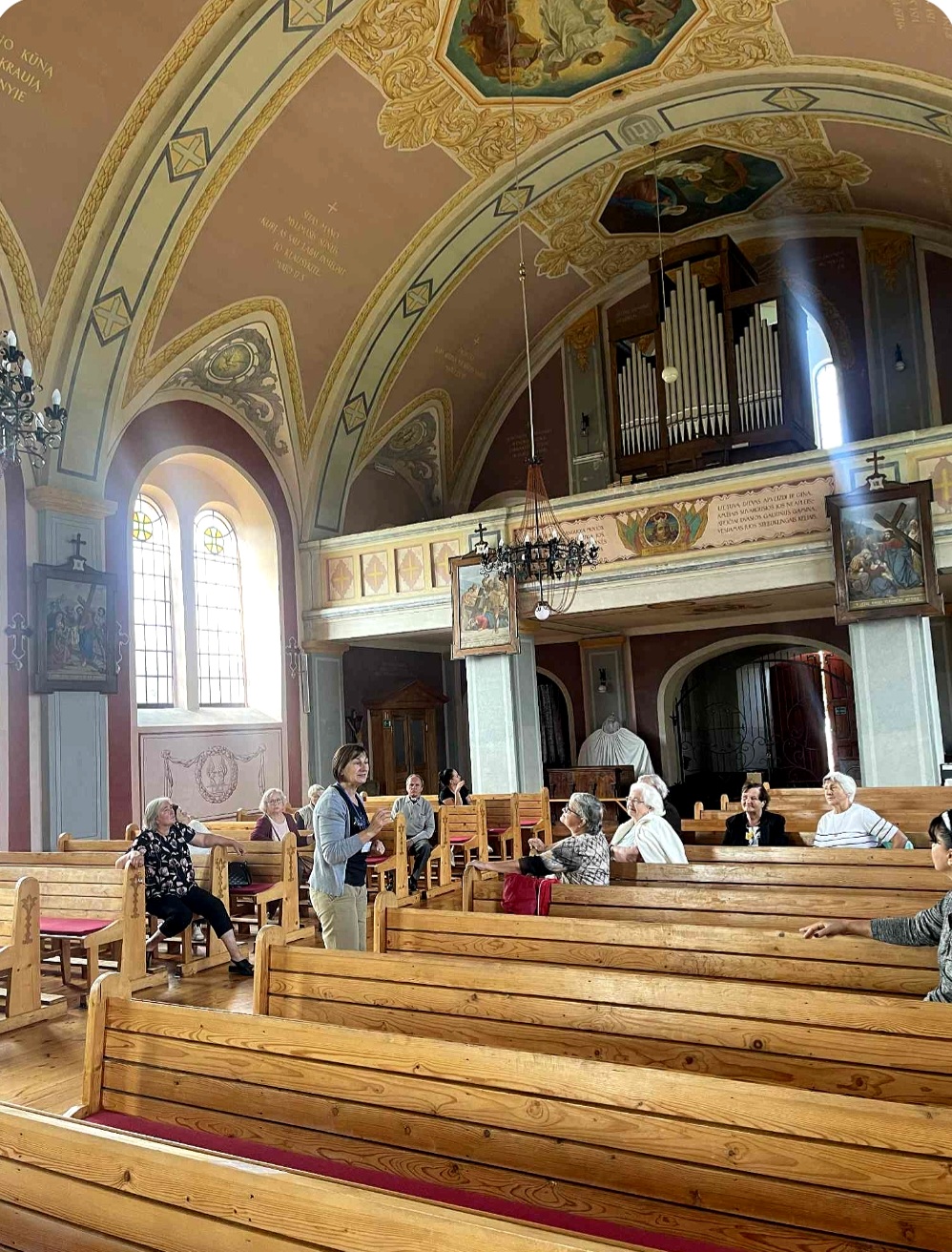 Po muziejaus lankymo, senjorų grupė kartu su gide Marija, pasuko link Perlojos Švč. Mergelės Marijos ir šv. Pranciškaus Asyžiečio bažnyčios. Ekskursijos dalyviai susipažino su Perlojos bažnyčios istorija. Pirmąją Perlojos bažnyčią apie 1428 metus pastatė Vytautas Didysis. 1930 m. pašventinama nauja Švč. Mergelės Marijos ir šv. Pranciškaus Asyžiečio bažnyčia, kuri II pasaulinio karo metais buvo išdekoruota. Dvasinės šventovės vidų puošia 1943 metais iš natūralių dažų sukurtas itin aukšto meninio lygio dekoras, valstybiniai bei patriotiniai akcentai, ji yra pati lietuviškiausia visoje Lietuvoje. Bažnyčios skliautuose nutapyti svarbiausi lietuvybės simboliai – Vytis, Gedimino stulpai, Jogailaičių kryžius, trispalvė, Vytauto Didžiojo portretas, išrašyti Lietuvos ir ateitininkų himnai ir, žinoma, legendinis kunigaikštis Perlius su šūkiu: „Už Perloją ir visą Lietuvą!“. Bažnyčioje galima pamatyti iš senosios maumedžio bažnyčios, pastatytos 1777 metais, išlikusias kryžiaus kelio stotis.