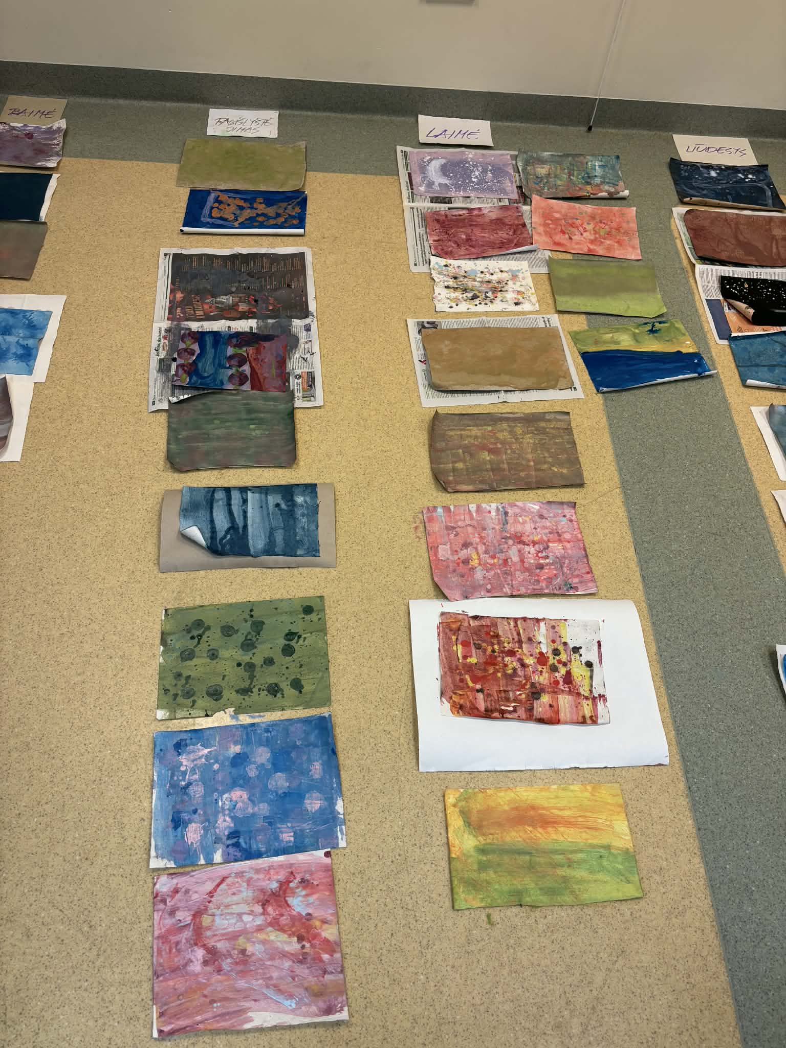 Liūdesys. Vaikai piešė ašaras, lietaus lašus. Spalvos buvo blankios, prislopintos – mėlyna, žalia, ruda.