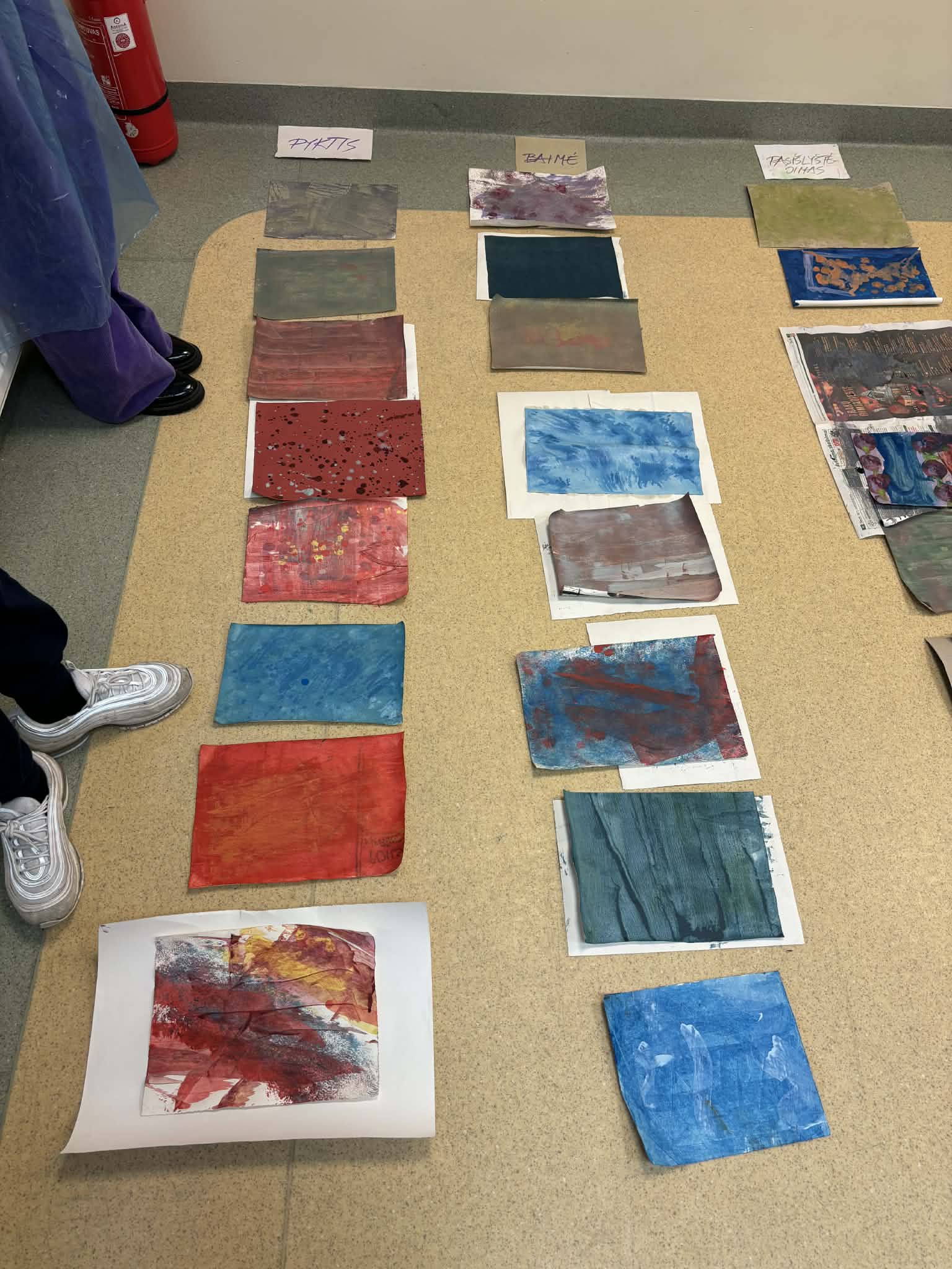 Baimė. Šiai emocijai vaikai dažnai rinkosi tamsesnes, šaltas spalvas, tokias kaip mėlyna, violetinė ir pilka. Piešiniuose dominavo neryškios formos, šešėliai ir paslėpti objektai.
