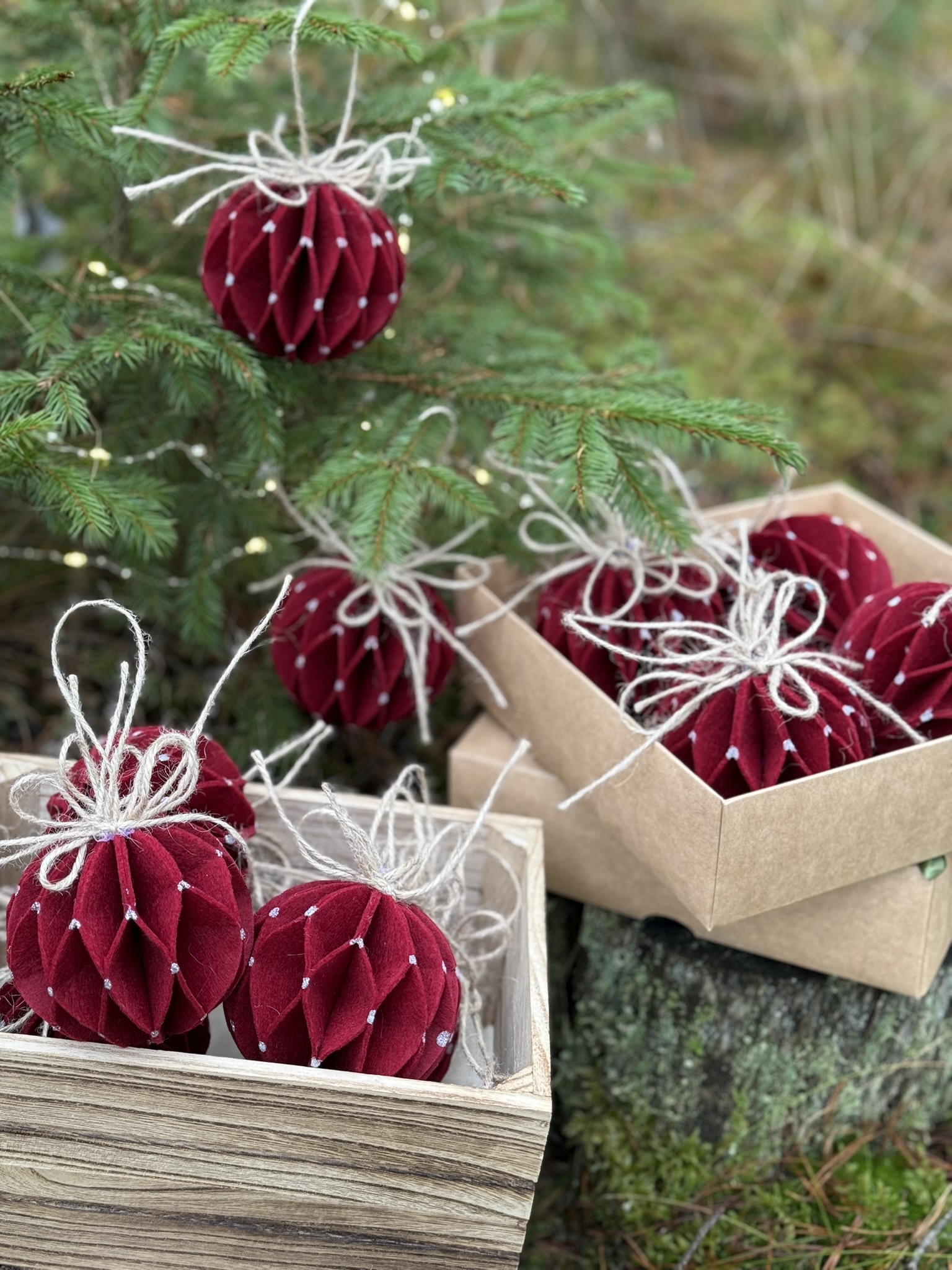 Rankų darbo kalėdinių eglutės žaisliukų iš veltinio rinkinys (6 vnt.) dovanų dėžutėje, dekoruotoje džiovintais apelsinais ir natūraliomis detalėmis