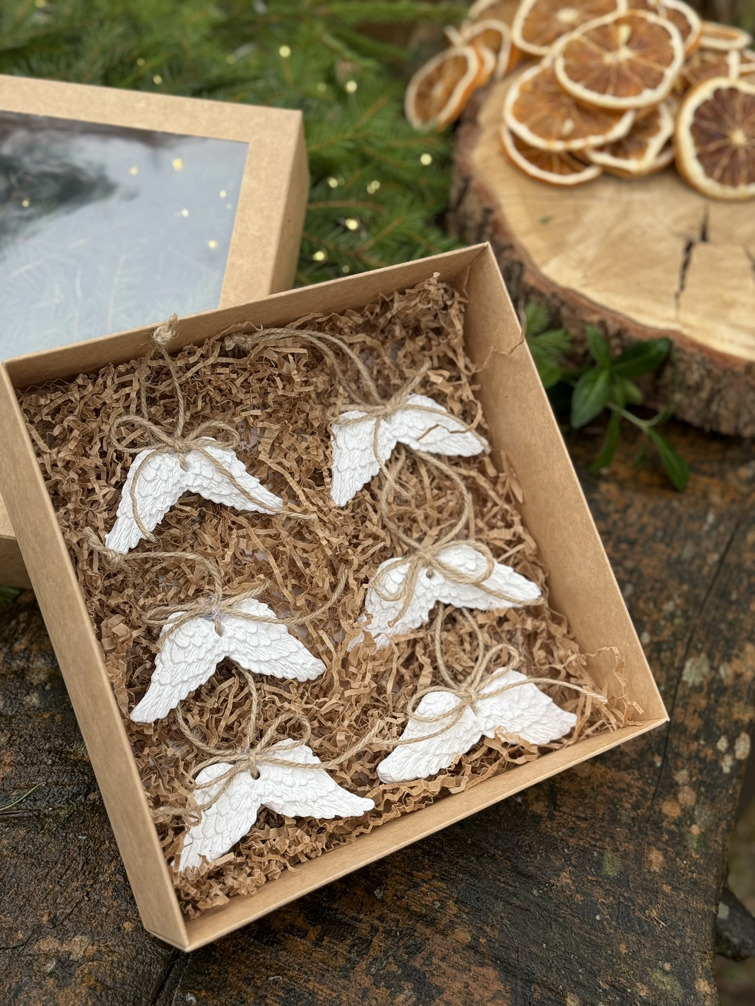 Rankų darbo keramikinių žaisliukų rinkinys (6 vnt.) dovanų dėžutėje, dekoruotoje džiovintais apelsinais ir natūraliomis detalėmis