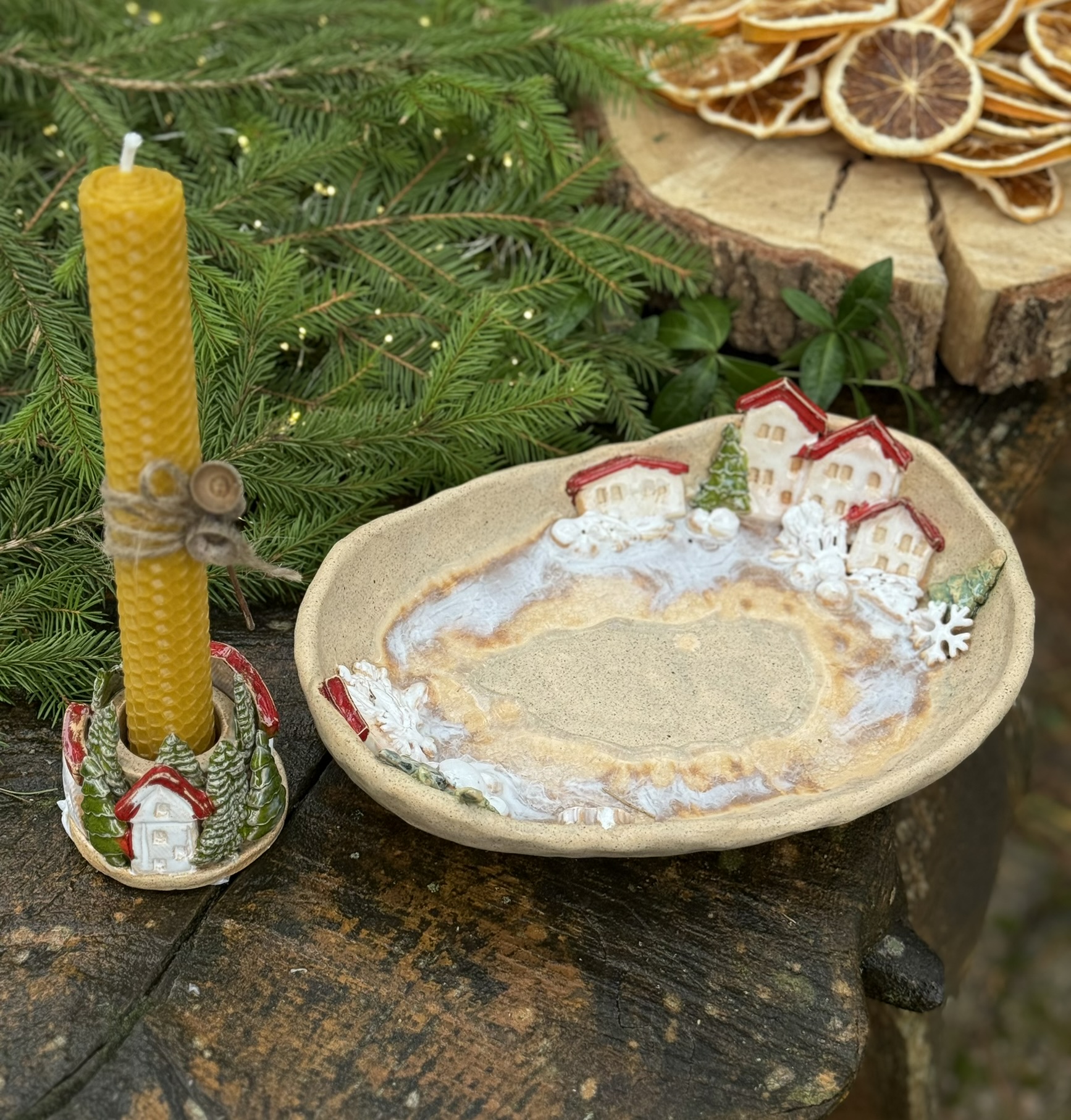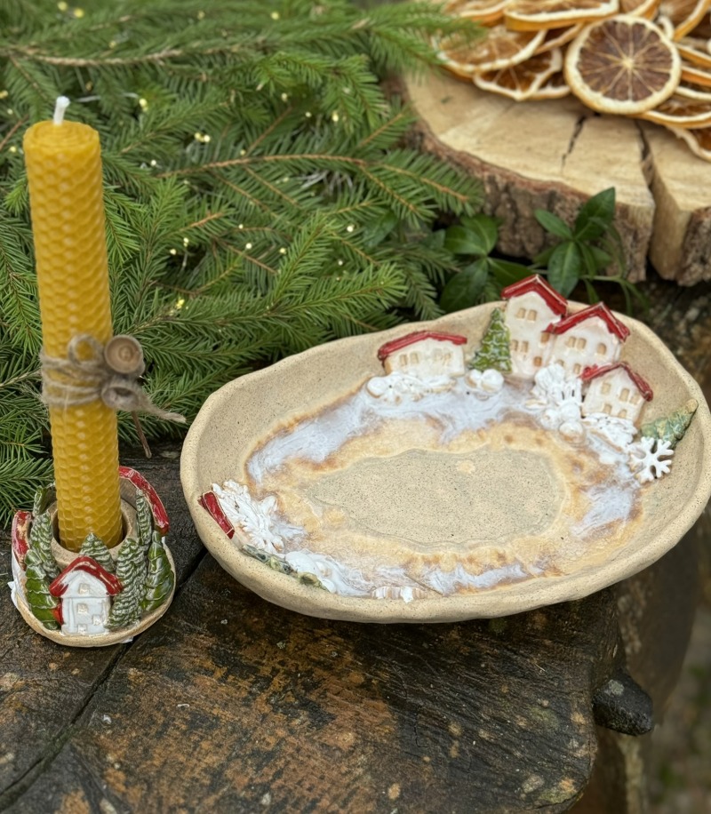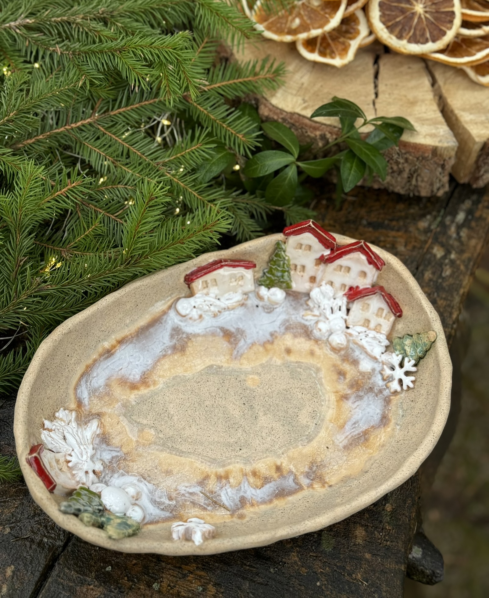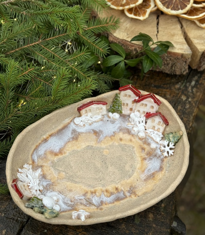 Rankų darbo keramikinis indas su unikaliomis namelių, eglučių, snaigių detalėmis