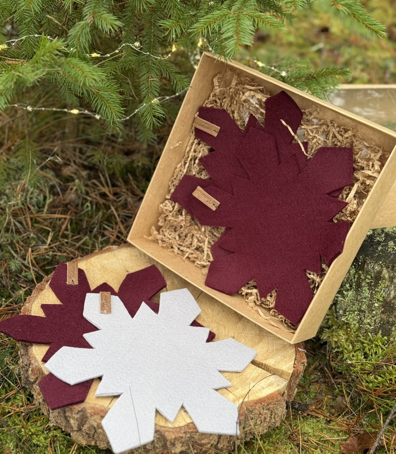 Rankų darbo stalo padėkliukas snaigė (iš veltinio) puodeliui