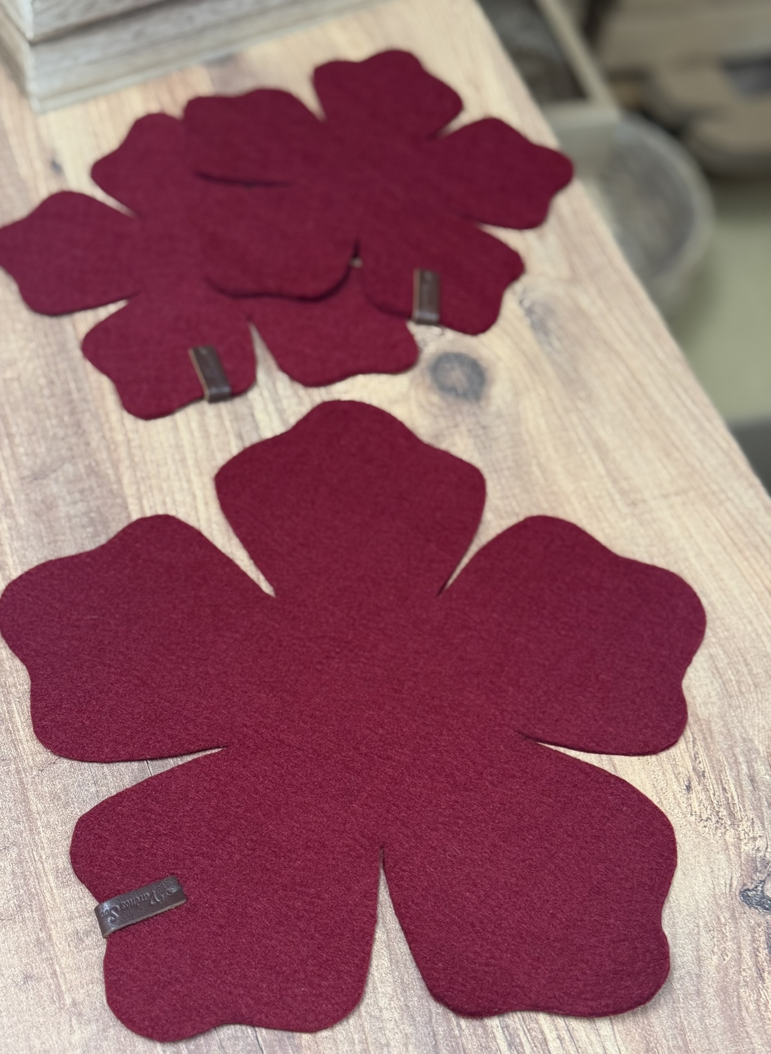 Padėkliukas lėkštei (26 cmX 26cm.) Forma: gėlės žiedas. Spalva: sodri vyšninė.