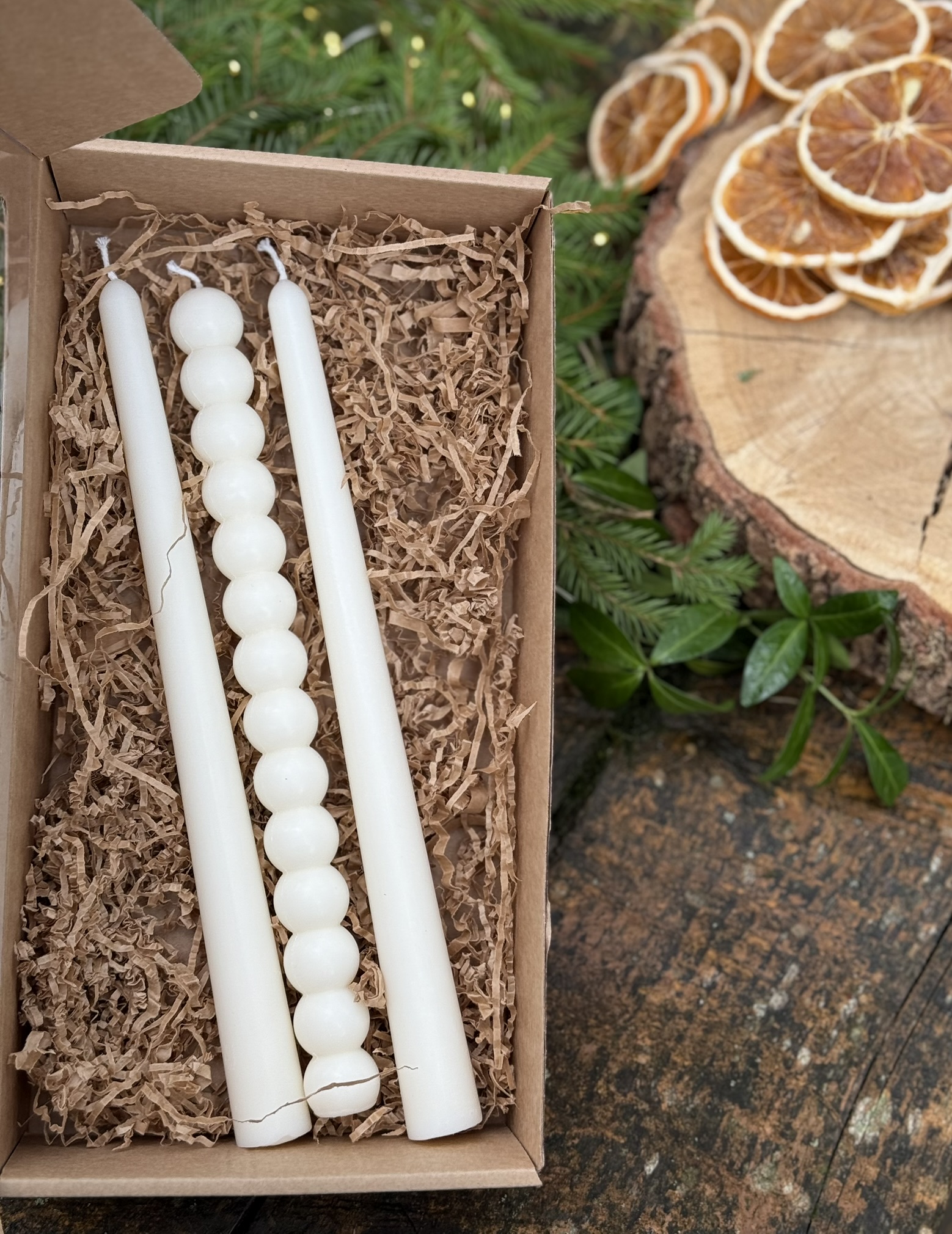 Rankų darbo natūralių sojos vaško žvakių rinkinys (3vnt.) dovanų dėžutėje, dekoruotoje džiovintais apelsinais ir natūraliomis detalėmis